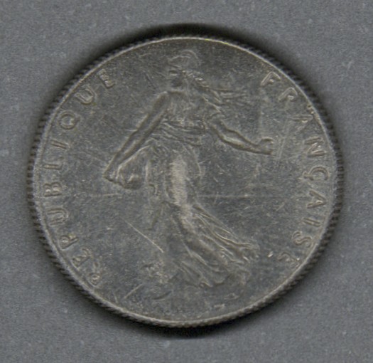 Moneda circulante normal de Francia. En anverso presenta figura femenina sembrando semillas, y al reverso se ubica al centro una rama de olivo; sobre ella, la denominación de la moneda, bajo ella el año, y alrededor la leyenda "LIBERTE·EGALITE·FRATERNITE". El grabador de ambas caras fue Louis-Oscar Roty, y el diseño del canto es fresado.