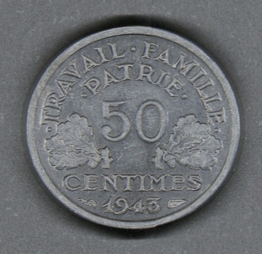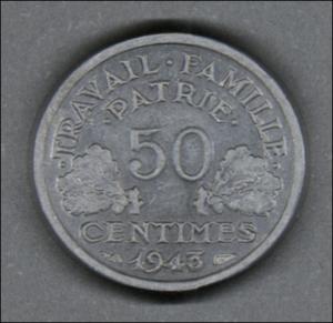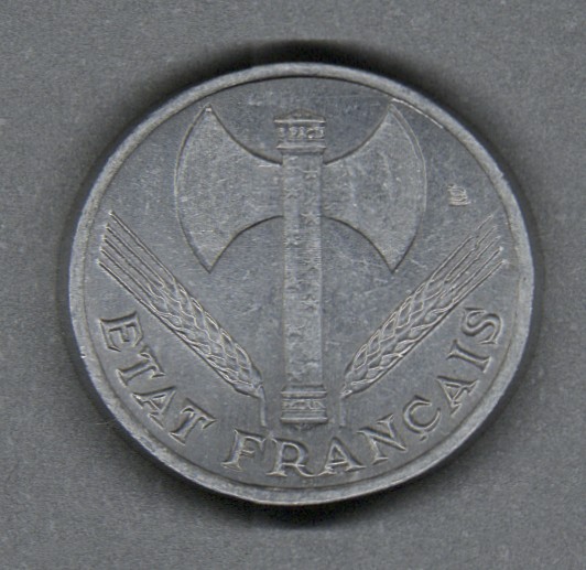 Moneda circulante normal de Francia. En anverso presenta hacha de doble filo con flanco de ramitas de trigo. Bordeando la mitad inferior, la leyenda "ETAT FRANÇAIS". Al reverso dos ramas de hoja de roble rodean el valor facial y el lema "TRAVAIL·FAMILLE·