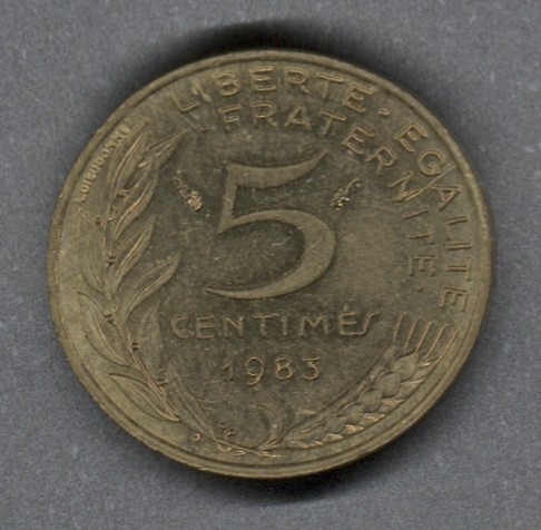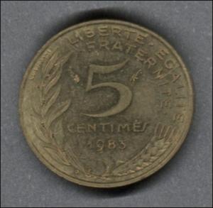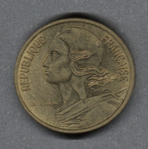 Moneda circulante normal de Francia. En anverso presenta a Marianne de perfil izquierdo, llevando el gorro frigio de la libertad, emblema nacional de Francia, rodeada de la inscripción "REPUBLIQUE FRANÇAISE". El grabador fue Henri Lagriffoul. Al reverso el valor facial está rodeado de una espiga de trigo, una rama de olivo y el lema francés: "LIBERTE - EGALITE - FRATERNITE". El grabador fue Adrien Dieudonné. El diseño del canto es llano.