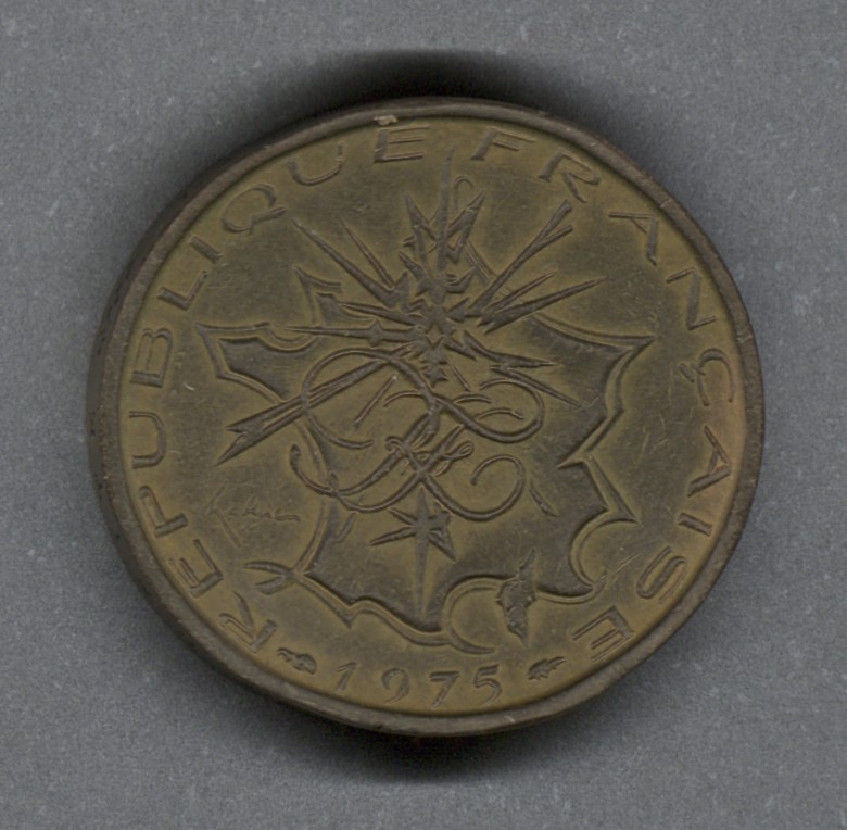 Moneda circulante normal de Francia. En anverso presenta un mapa de Francia metropolitana con destellos que señalan París, e iniciales estilizadas RF en la parte superior con leyenda alrededor del exterior que indica "REPUBLIQUE FRANÇAISE", fecha debajo con marca privada. Al reverso valor en la banda del centro e industria al fondo. El grabador de ambas caras fue Georges Mathieu. El diseño del canto es liso, con la inscripción "LIBERTE EGALITE FRATERNITE" separado por motivos.