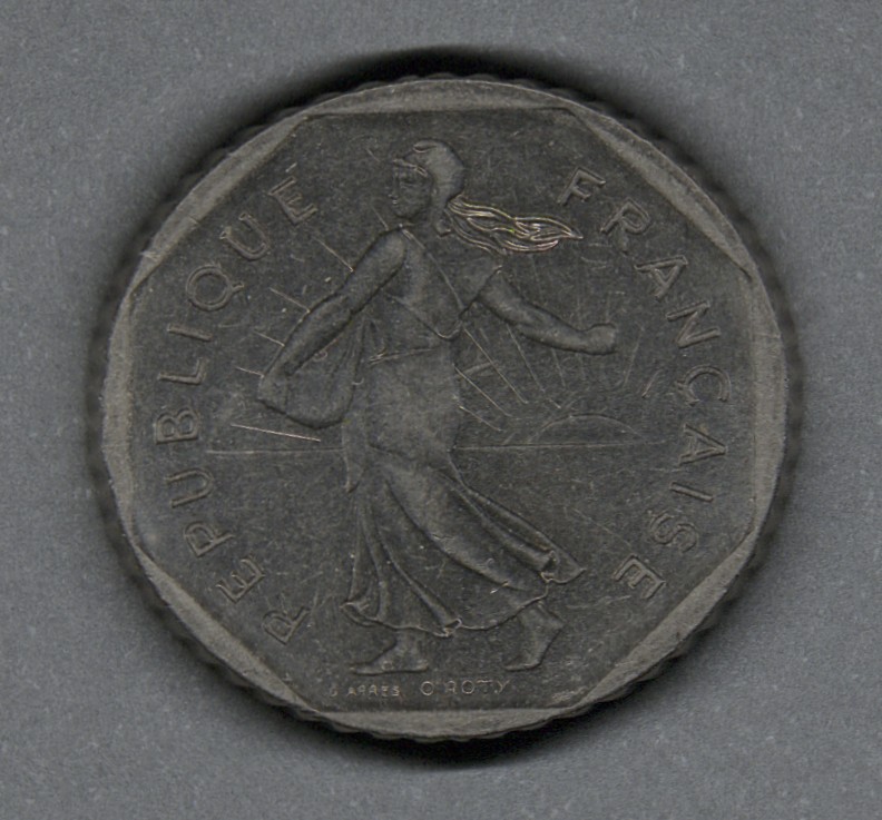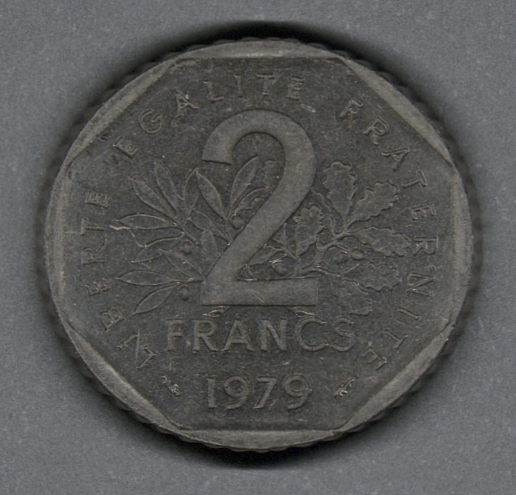 Moneda circulante normal de Francia. En anverso presenta imagen de El Sembrador, diseñado por Oscar Roty en 1900: emblema nacional de la República Francesa, encajado en forma octogonal. En el borde interior de esta forma octogonal, la leyenda "REPUBLIQUE FRANÇAISE". Al reverso una rama de olivo y otra de roble, detrás del valor facial, están rodeadas del lema francés: "LIBERTE - EGALITE - FRATERNITE", también todo encajado dentro de forma octogonal. El diseño del canto es fresado con espaciado amplio.