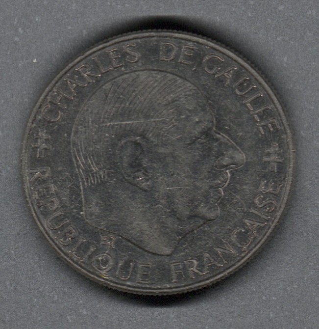 Moneda circulante conmemorativa de Francia por el 30º aniversario de la V República. En anverso presenta retrato de perfil hacia la derecha de Charles de Gaulle, rodeado de la inscripción "RÉPUBLIQUE FRANÇAISE". Al reverso denominación dentro de una corona de seis lados, fechas debajo y en la parte superior del borde, la leyenda "LIBERTÉ · EGALITÉ · FRATERNITÉ". El grabador de ambas caras fue Émile Rousseau. El diseño del canto es juncoso.