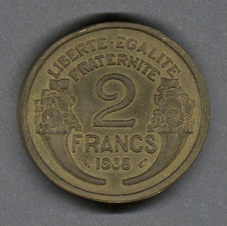 Moneda circulante normal de Francia. En anverso presenta cabeza de Marianne a la izquierda con gorro frigio decorado con una corona compuesta de hojas de olivo, roble y trigo. Alrededor, la leyenda "REPVBLIQVE FRANÇAISE". Al reverso valor decorado a ambos lados por la Cornucopia (o cuerno de la abundancia, rebosante de productos, flores o frutos secos) y la leyenda "LIBERTE-EGALITE-FRATERNITE" sobre el valor. La grabación de ambas caras estuvo a cargo de Pierre-Alexandre Morlon, y el diseño del canto es llano.