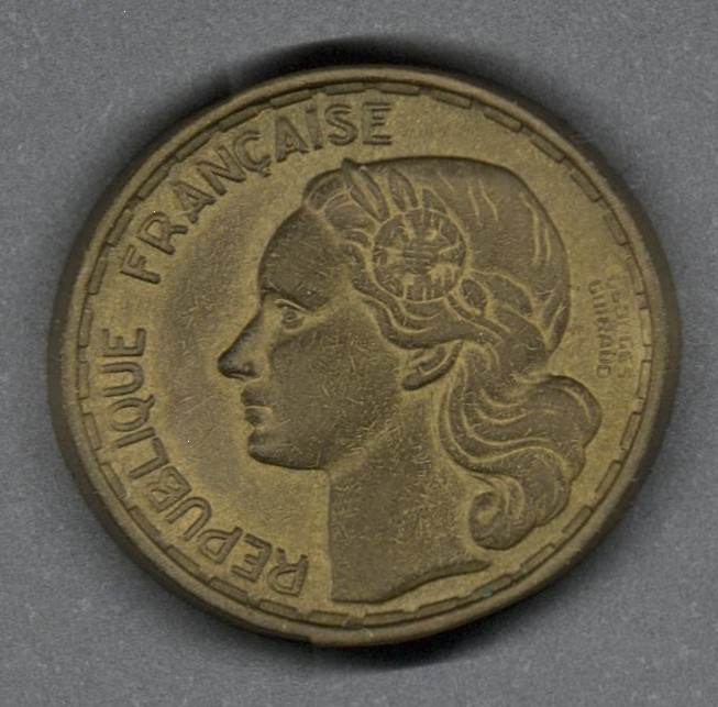 Moneda circulante normal de Francia. En anverso presenta cabeza femenina mirando a la izquierda, diseñador, leyenda. NOTA: Firma completa (comparar KM#917; acortada). Al reverso gallo mirando a la derecha, rama de laurel, valor, año de producción, motivo alrededor del borde. El grabador de ambas caras fue Georges Guiraud, y el diseño del canto es llano.