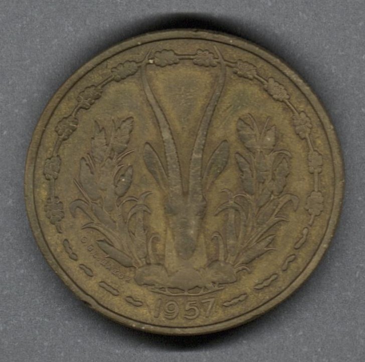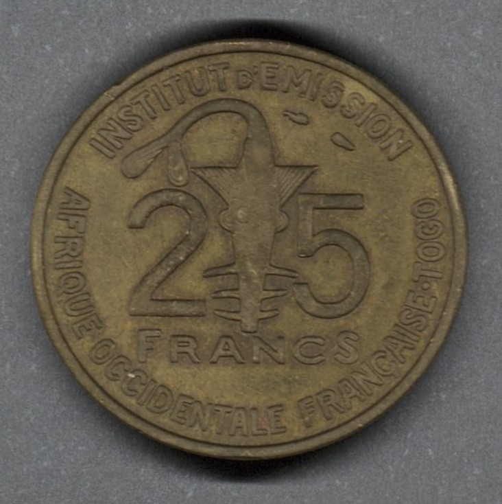 Moneda circulante normal de Togo. En anverso presenta un "Taku", pez sierra símbolo de prosperidad y logotipo del BCEAO, dividiendo el valor. Al reverso cabeza de gacela de cuernos finos o gacela Rhim (Gazella leptoceros), rodeada de guirnaldas de plantas de maíz y la fecha en el borde inferior. El grabador de ambas caras fue Lucien Georges Bazor y el diseño del canto es juncoso.