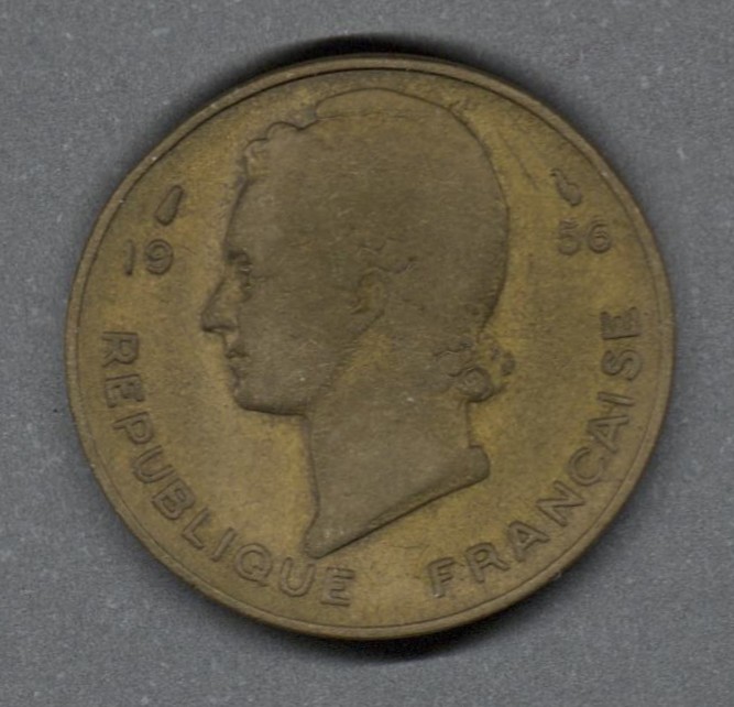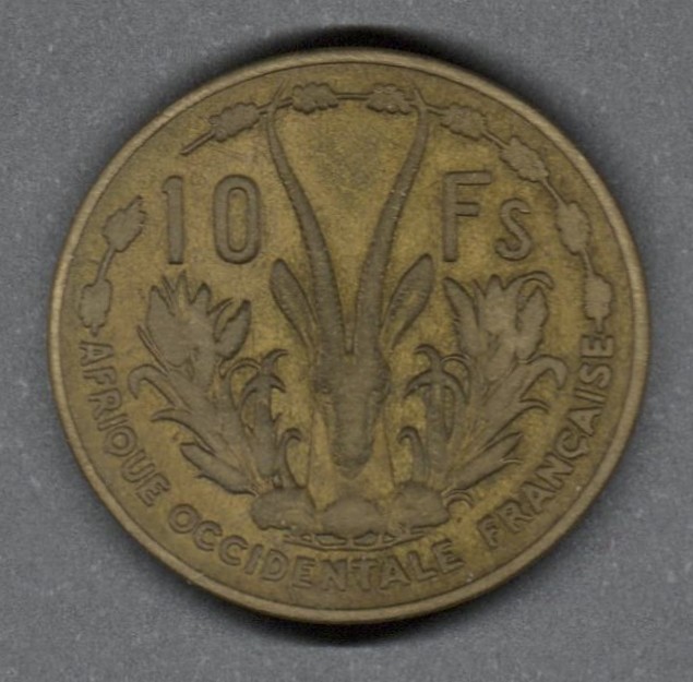 Moneda circulante normal de África Occidental Francesa. En anverso presenta cabeza de Marianne mirando hacia la izquierda, con gorro frigio con la tradicional escarapela francesa que divide la fecha junto con la marca privada sobre el 19 de la fecha (el ala era el símbolo del Grabador General en el momento de la acuñación) junto con la marca de ceca (una cornucopia era el símbolo de la Monnaie de Paris) y la firma de G.B.L. Bazor en el cuello. Al reverso, cabeza de gacela dentro de tallos de maíz dividiendo la denominación; el borde superior está vinculado al sorgo (un cultivo alimentario agrícola) y el borde inferior posee la leyenda "AFRIQUE OCCIDENTALE FRANÇAISE". El grabador de ambas caras fue Lucien Georges Bazor, y el diseño del canto es llano.