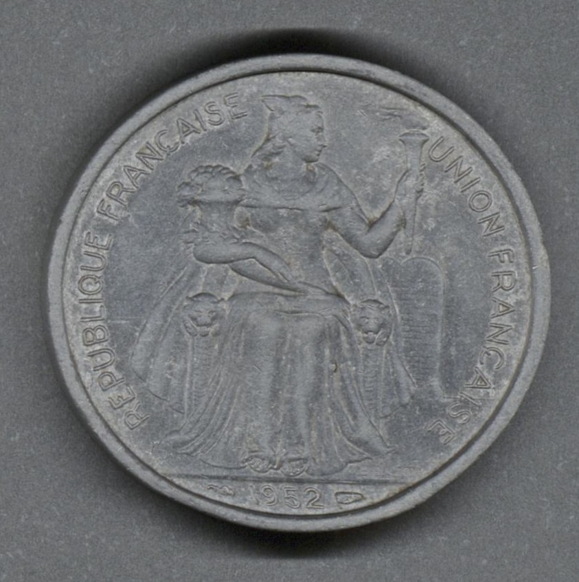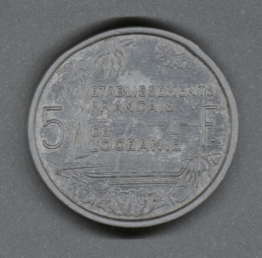 Moneda circulante normal de la Polinesia Francesa, en anverso presenta a Marianne sentada, adornada con un gorro frigio alado (símbolo de la Libertad), con una cornucopia (con frutas y frutos secos) en la mano derecha y una antorcha encendida en la izquierda. La rodea la leyenda "REPUBLIQUE FRANÇAISE UNION FRANÇAISE". Al reverso paisaje de isla con palmeras, barcos (velero y bote de remos), frutero, flor. Al centro la leyenda "ETABLISSEMENTS FRANÇAIS DE L'OCÉANIE" y a cada lado de ésta, el valor nominal. El grabador de ambas caras fue Lucien Georges Bazor, y el diseño del canto es liso.