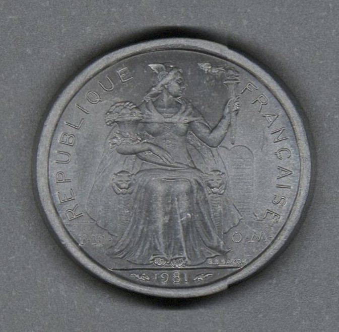 Moneda circulante normal de la Polinesia Francesa, en anverso presenta a Libertad sentada en un trono, mirando hacia la izquierda y sosteniendo una antorcha encendida en la mano izquierda. Fruta variada en una cornucopia en la curva del brazo derecho. El grabador de ambas caras fue Lucien Georges Bazor, y el diseño del canto es llano.