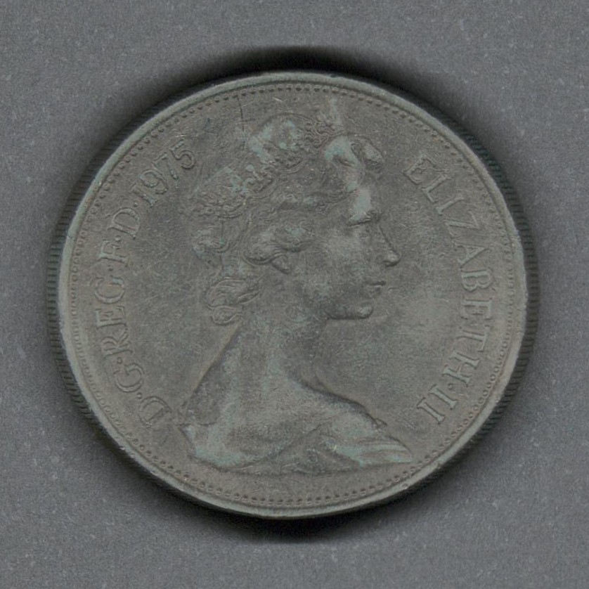 | Moneda de cuproníquel. Casa de moneda Royal Mint (Tower Hill), Londres, Reino Unido (1810-1975), Royal Mint, Llantrisant, Reino Unido (1968-presente) |