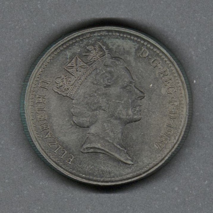 Monedas circulantes normales de Reino Unido. En anverso tercer retrato coronado de la reina Isabel II mirando a la derecha, con la diadema de Estado de Jorge IV, leyenda alrededor. En reverso insignia de Escocia, un cardo coronado real, leyenda arriba, denominación abajo.