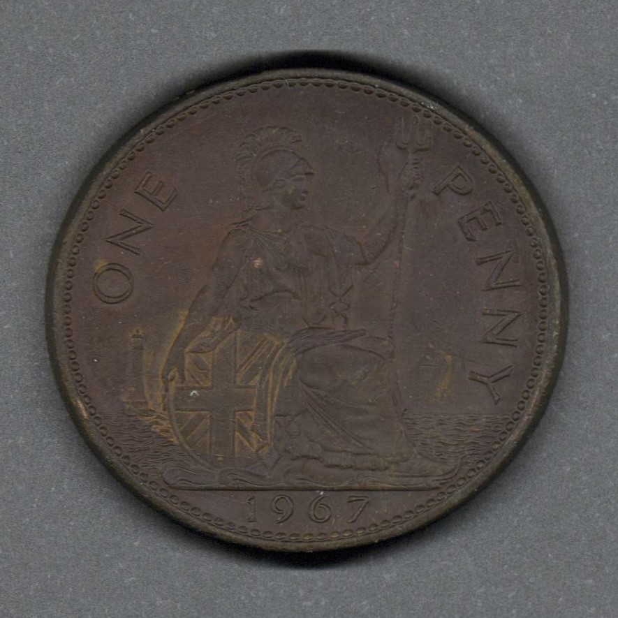Monedas circulantes normales de Reino Unido. En anverso retrato laureado joven de la reina Isabel II mirando hacia la derecha, leyenda alrededor. En reverso figura de Britannia a la derecha, con tridente en la mano izquierda y escudo con la bandera de la Unión en la derecha, mar detrás con faro a la izquierda, denominación encima y fecha debajo.
