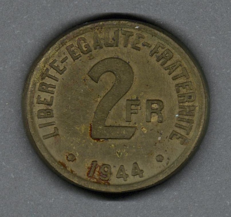 Moneda de emergencia de Francia, en anverso presenta el nombre del país dentro de una corona, y al reverso, la denominación en caracteres grandes encima de la fecha, con el lema francés alrededor del borde. Su grabador fue el Atelier de Philadelphie y el diseño del canto es llano. Los soldados que participaron en el desembarco de Provenza recibieron estas monedas, que circularon por el sur de Francia y Argelia. Esta moneda no oficial fue regulada por el ministro de Finanzas el 25 de junio de 1945.