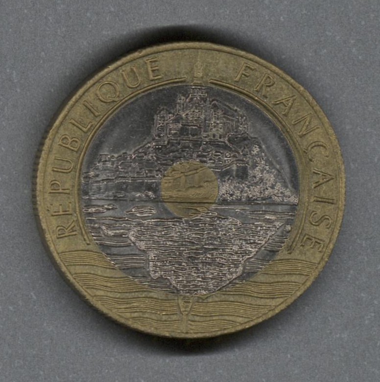Moneda circulante normal de Francia. En anverso presenta el Monte Saint-Michel, isla rocosa mareal de Normandía, reflejándose en su bahía. En el borde dorado, la inscripción "RÉPUBLIQUE FRANÇAISE". Su grabador fue Jean-Pierre Rethoré y el Atelier de Gravure (A.G.M.M.) y el diseño estuvo a cargo de Jean-Luc Maréchal. Al reverso valor facial tachado con bandas anchas rodeadas con el lema francés ("LIBERTÉ ÉGALITÉ FRATERNITÉ"), grabada en el Atelier de Gravure (A.G.M.M.). El diseño del canto es liso con 4 o 5 grupos de cañas.