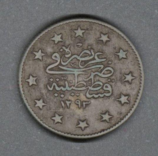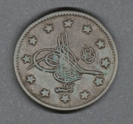 Moneda circulante normal del Imperio Otomano, en anverso presenta tugra del sultán Abdul Hamid II (1876-1909) junto a la inscripción "el-Ghazi", título honorífico. Al reverso texto en árabe, valor y fecha dentro de un círculo de estrellas. El diseño del canto es juncoso.