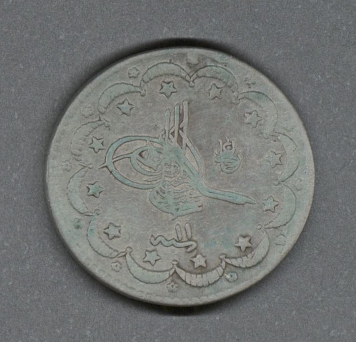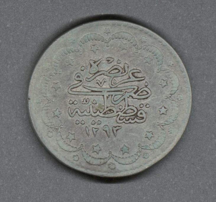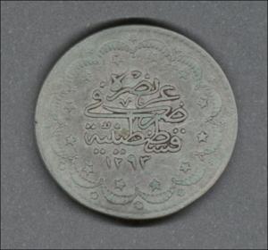 | Composición: Plata 830. Casa de moneda: Constantinopla, actualmente Istanbul, Turquía (476-1923). Año de acuñación no visible, solamente se puede apreciar el año 1876 (correspondiendo al año 1293 del calendario islámico o Hégira), fecha en que el sultán Abdulhamid II ascendió al trono. |