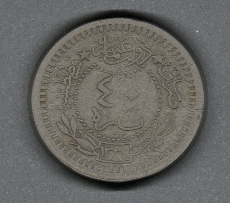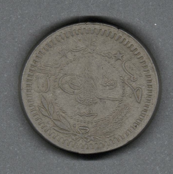Moneda circulante normal del Imperio Otomano, en anverso presenta tugra del sultán Mehmed V (1909-1918) con el honorífico "Reşâd " a la derecha, dentro de un círculo de cuentas y sobre el año regnal; alrededor, la divisa seguida de una rama de olivo y una gavilla de trigo anudadas. Al reverso la denominación dentro de una media luna de cuentas; alrededor, el nombre de la ceca separado del nombre del país y seguido de la fecha de ingreso del sultán sobre una rama de olivo y una gavilla de trigo. El diseño del canto es llano.