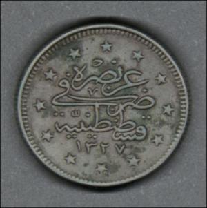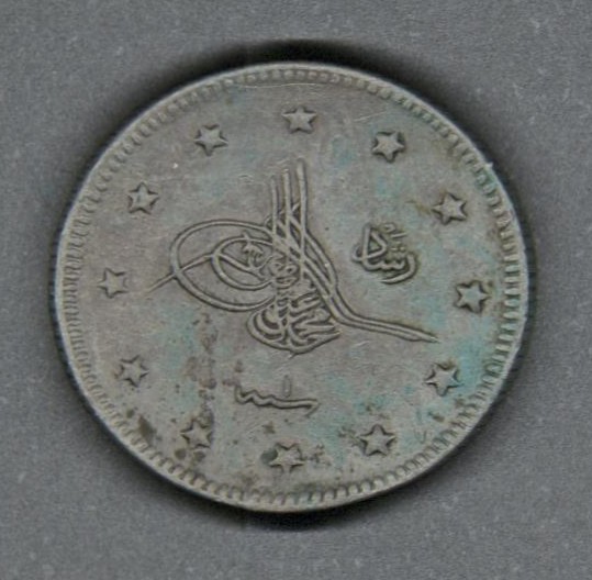 Moneda circulante normal del Imperio Otomano, en anverso presenta tugra del sultán Mehmed V (1909-1918) con el honorífico "Reşâd " a la derecha. Al reverso inscripción y fecha dentro de un borde estrellado. El diseño del canto es juncoso.