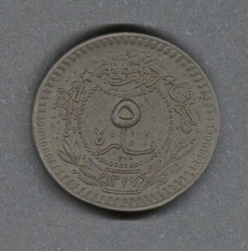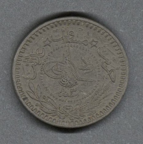 Moneda circulante normal del Imperio Otomano, en anverso presenta tugra del sultán Mehmed V (1909-1918) con el honorífico "Reşâd " a la derecha. Al reverso inscripción y fecha dentro de un círculo de cuentas. El diseño del canto es llano.
