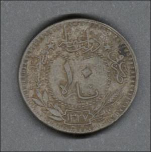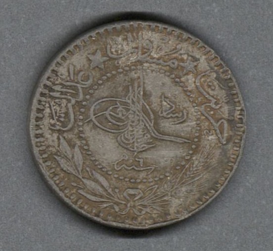 Moneda circulante normal del Imperio Otomano, en anverso presenta tugra del sultán Mehmed V (1909-1918) con el honorífico "Reşâd " a la derecha, dentro de un círculo de cuentas y sobre el año regnal; alrededor, la divisa seguida de una rama de olivo y una gavilla de trigo anudadas. Al reverso valor árabe dentro de una media luna rebordeada; alrededor, el nombre de la ceca separado del nombre del país y seguido de la fecha de ingreso del sultán sobre una rama de olivo y una gavilla de trigo. El diseño del canto es llano.