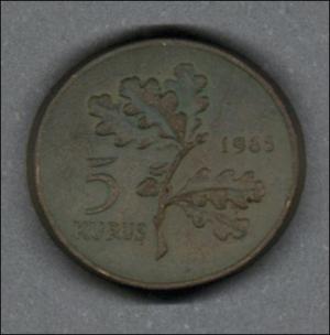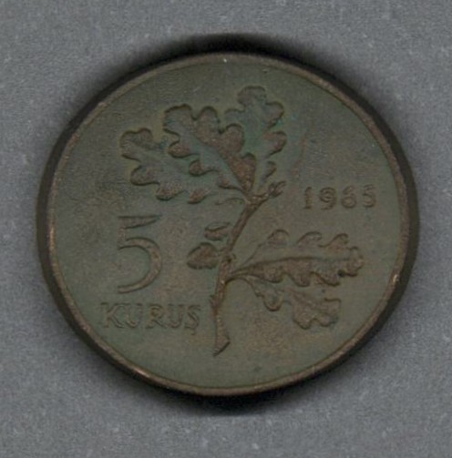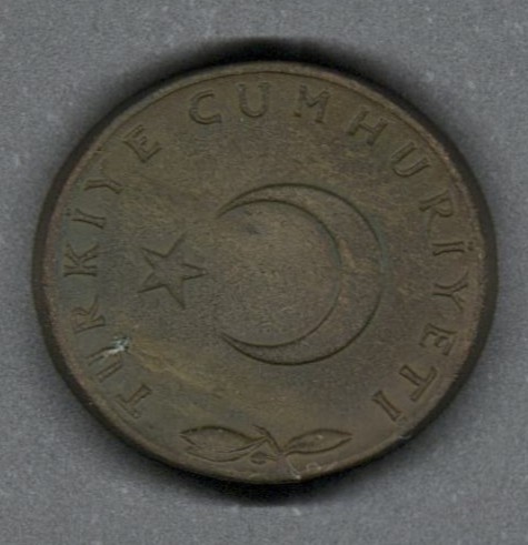 Moneda circulante normal de Turquía, en anverso presenta estrella sobre media luna, rodeada de leyenda "TÜRKİYE CUMHURİYETİ". Al reverso una rama de roble en el centro con la fecha a la derecha y la denominación a la izquierda. El grabador a cargo fue Pietro Giampaoli. El diseño del canto es llano.