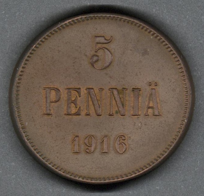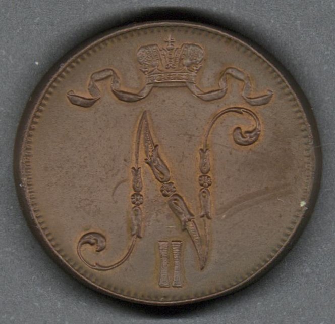 | Moneda de cobre. Casa de moneda de Finlandia (Suomen Rahapaja), Helsinki, Finlandia (1860-1988). |