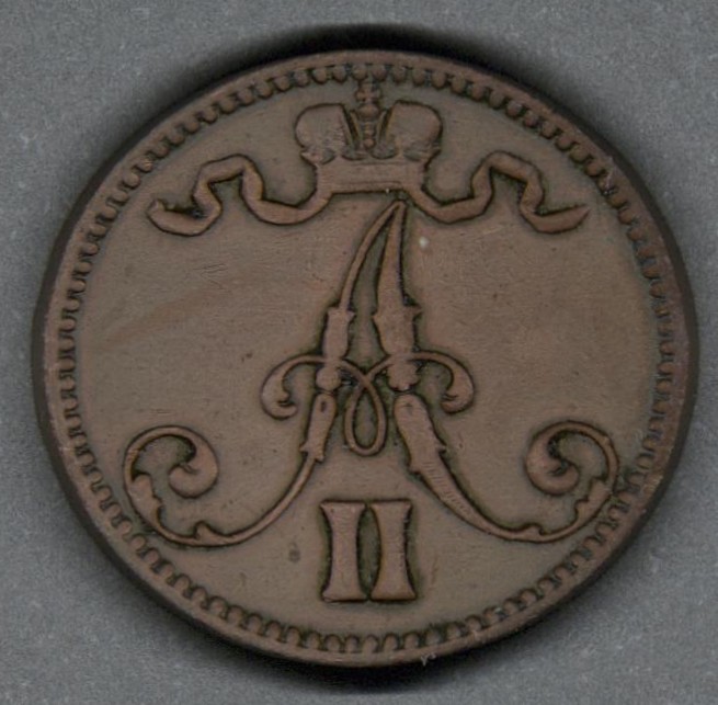 | Moneda de cobre. Casa de moneda de Finlandia (Suomen Rahapaja), Helsinki, Finlandia (1860-1988). |