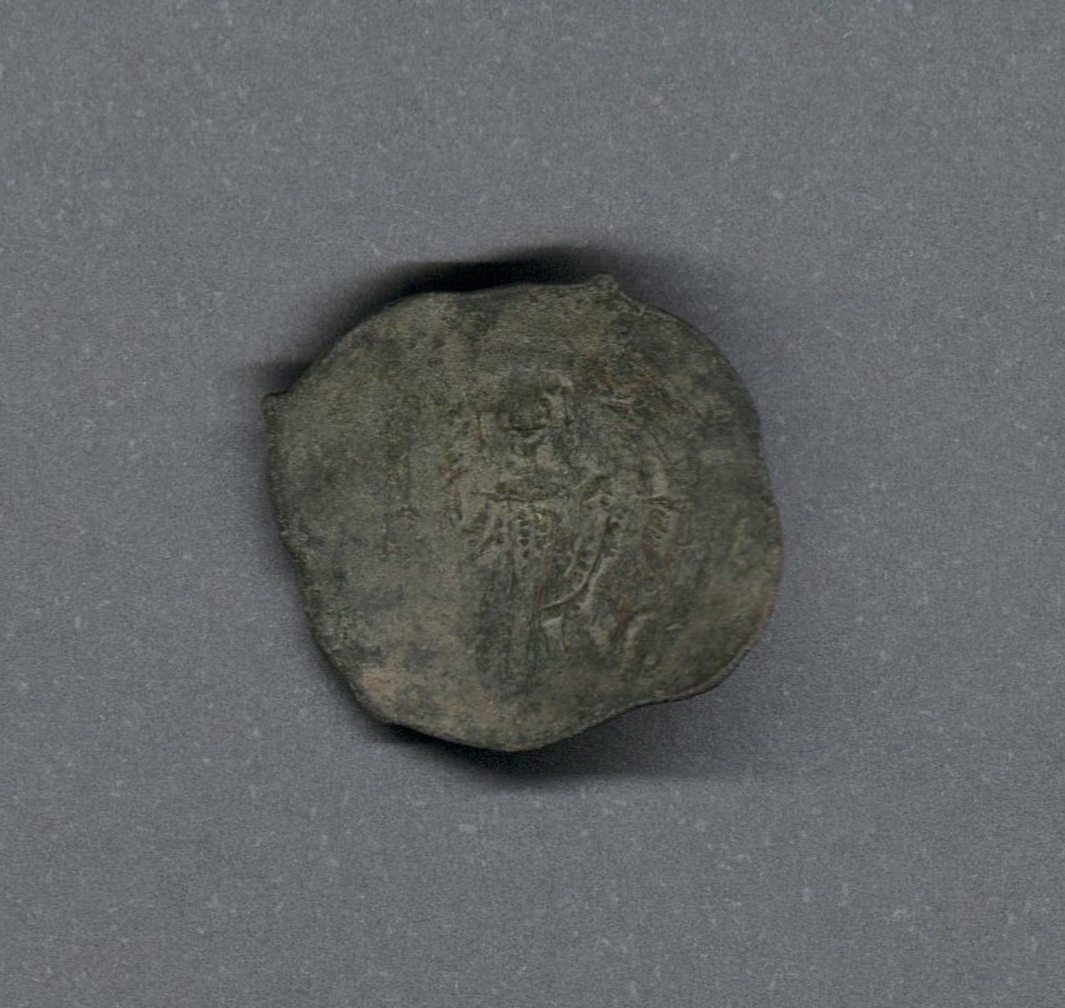 Pieza en estado de conservación regular, por lo que no es posible una identificación exacta, se propone una descripción tentativa a partir del tipo general y se sugiere mayor investigación. Moneda acuñada en el Imperio Bizantino, después de la reforma monetaria de Alejo I Comneno. Anverso desgastado. Reverso con el emperador de pie coronado, leyenda desgastada. Cospel escifado y recortado (clipped), fabricada por acuñación a martillo y peso reducido en 1,2 gr.